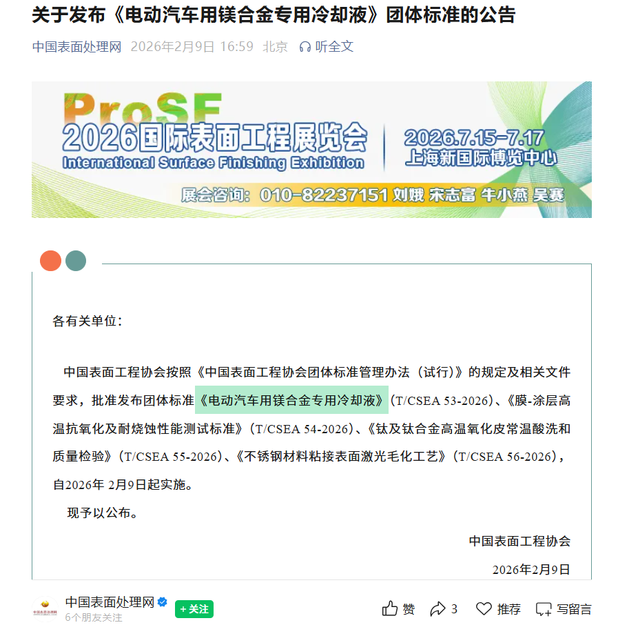 近日,由中国表面工程协会批准发布的《电动汽车用镁合金专用冷却液》(T/CSEA 53-2026)团体标准自2026年2月9日起正式实施。